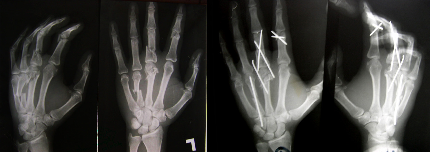 Fractures, to both hand and wrist, are caused by an impact to the bone that is strong enough to break it. Symptoms include severe pain, loss of movement and swelling. Whatever caused the fracture – whether it was a fall, a fight, a sporting accident or anything else – can influence the treatment, so it"s helpful for the surgeon to know exactly how the break occurred. The problem will most likely be dealt with first by an Accident & Emergency department, before being passed on to a hand surgery team, including the surgeon, nurses and therapists.